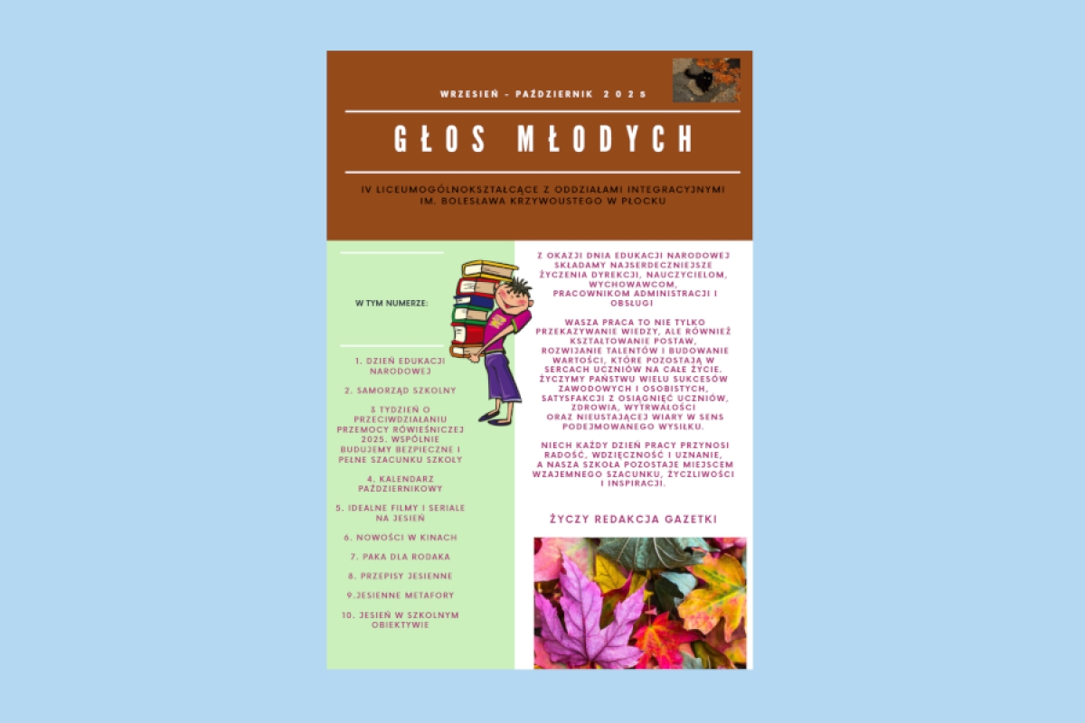 Zapraszamy do lektury kolejnego numeru gazetki szkolnej "Głos Młodych". W numerze m.in. życzenia z okazji Dnia Edukacji Narodowej, informacje o Samorządzie Uczniowskim, akcji "Paka dla Rodaka" i wiele innych ciekawych informacji.